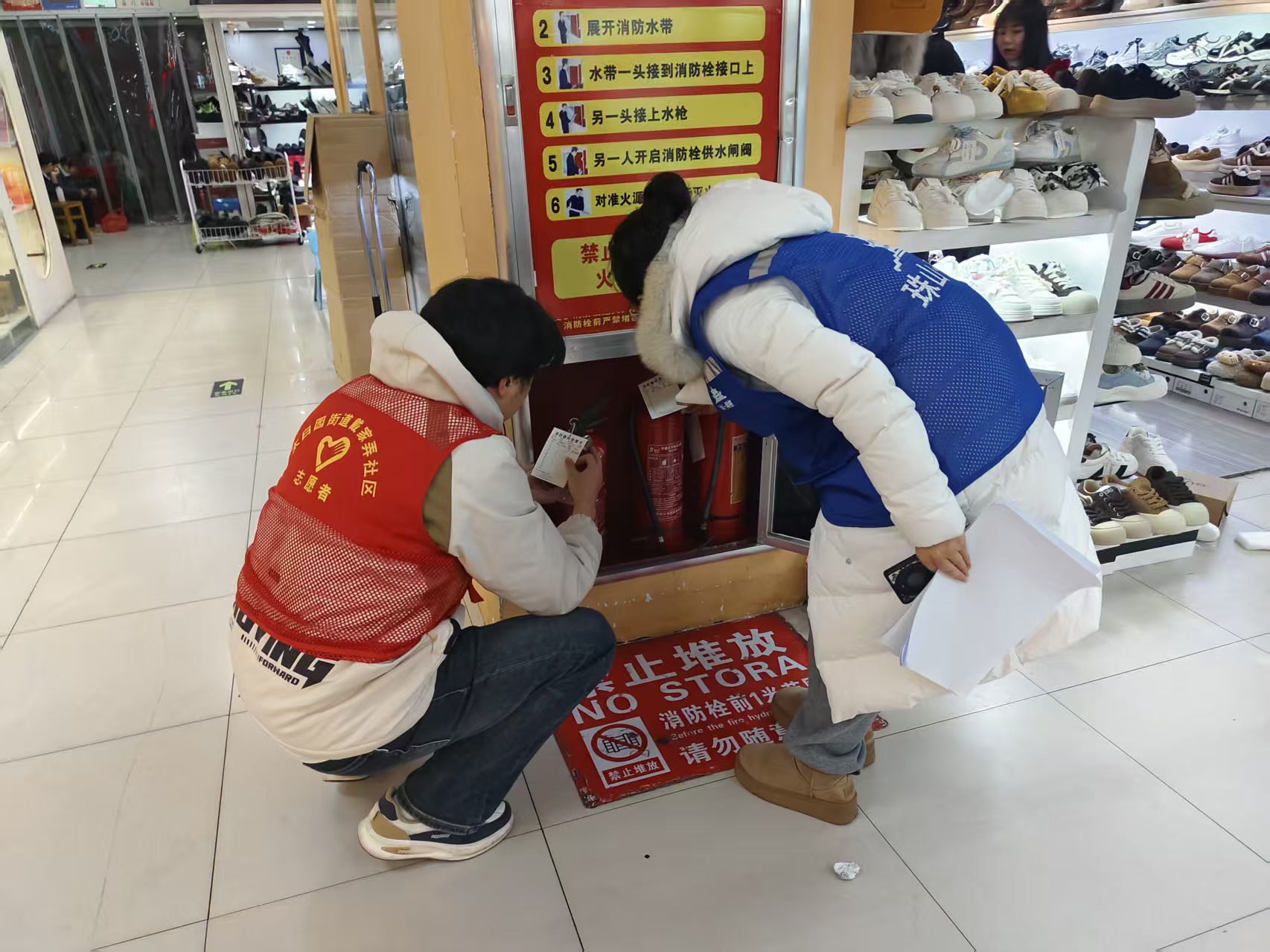 活动前期,社区通过宣传栏张贴海报、业主群推送通知、网格员入户宣讲等多种形式,向居民普及楼道堆物的安全危害,倡导大家自觉清理私人物品,主动参与到消防安全共建中。排查过程中,社区工作人员、网格员与志愿者组成专项工作组,对辖区内居民楼栋、商场进行“拉网式”检查,重点排查楼道内堆放的废旧家具、纸箱、自行车等杂物,以及堵塞消防通道、占用消防栓、私拉乱接电线等违规行为。对排查发现的问题,工作人员当场登记造册,能立即整改的现场协助居民清理;无法即时处理的,发放整改通知书,明确整改时限并跟踪落实。